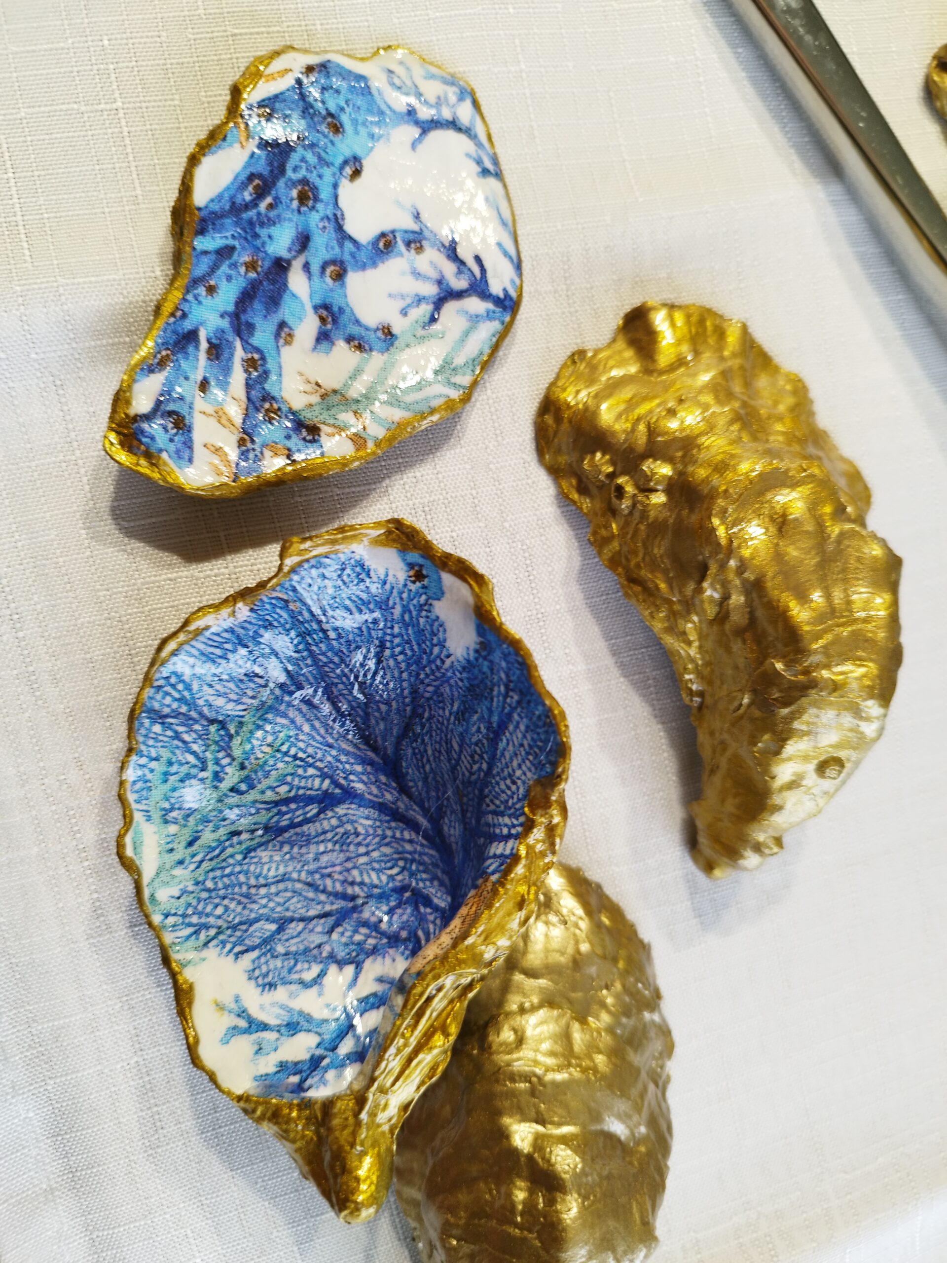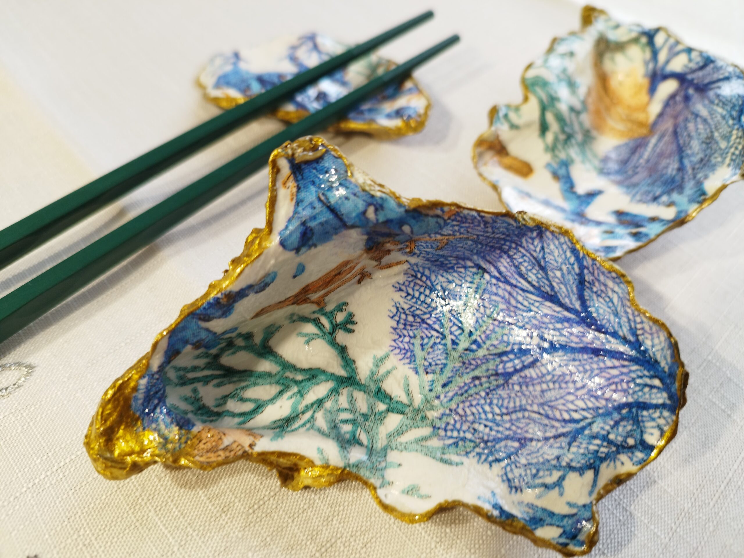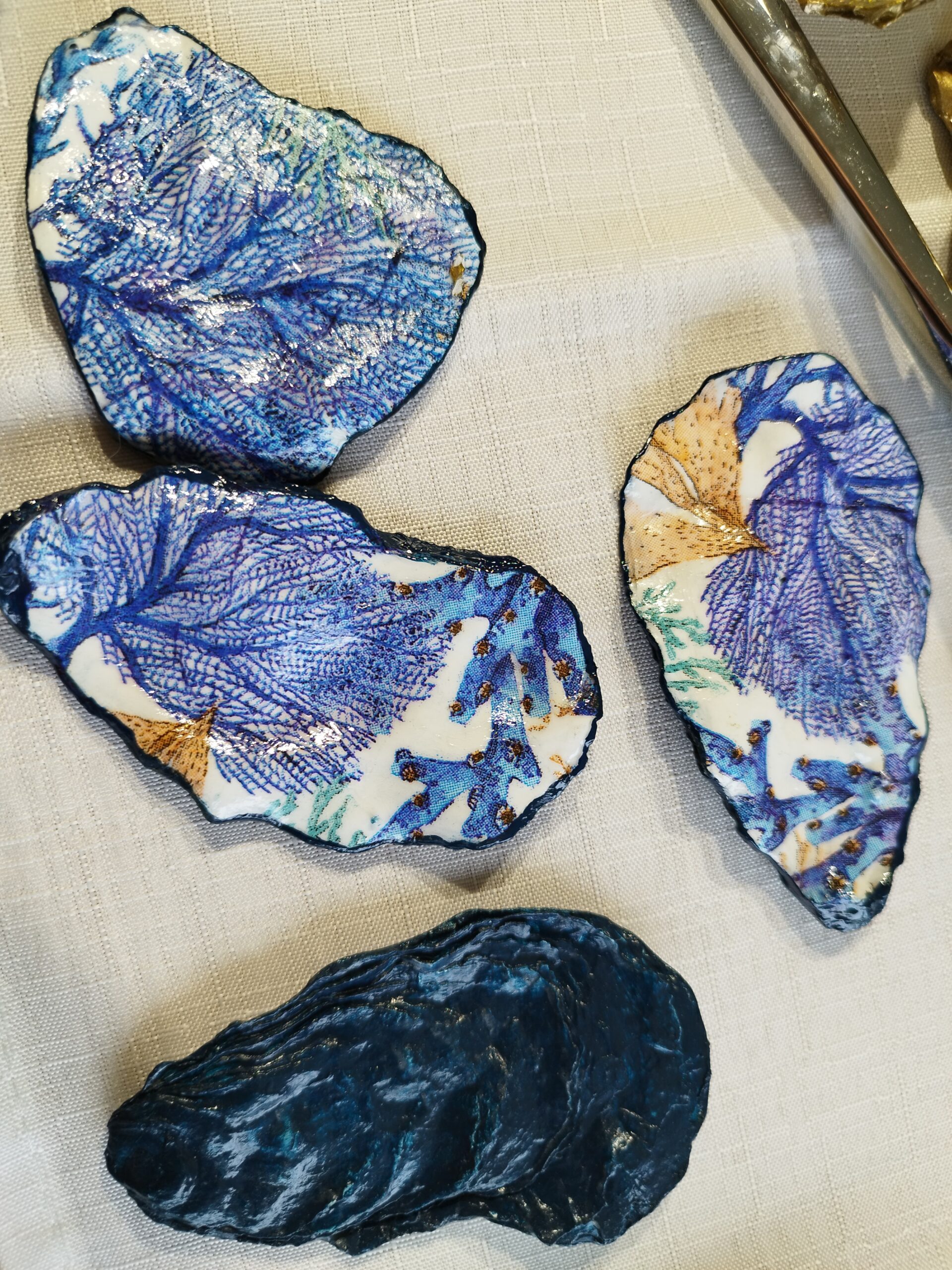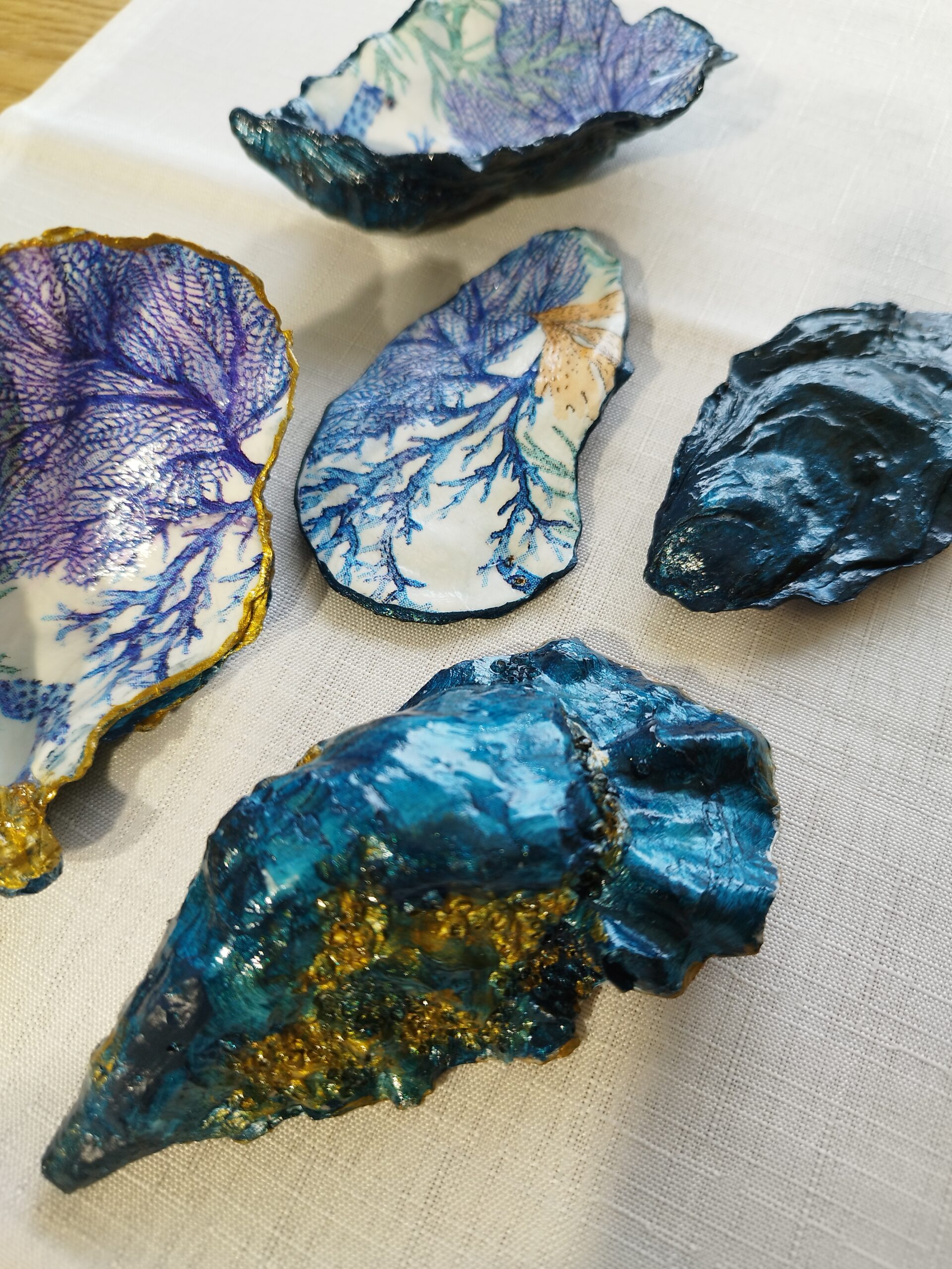 Je réalise à la main ces décorations uniques à partir de coquilles d’huitres creuses naturelles à Pont-Aven en Bretagne. La décoration soignée est réalisée à la main, dorure au pinceau, peinture et papiers décorés, vernis. Chaque « objet d’art » est unique, forme, motifs, liseret de couleur et dos : doré, ou bleu océan. Il y a peu de stock, la réalisation peut être faite à la demande: précisez bien vos souhaits et vos préférences à l’artiste.