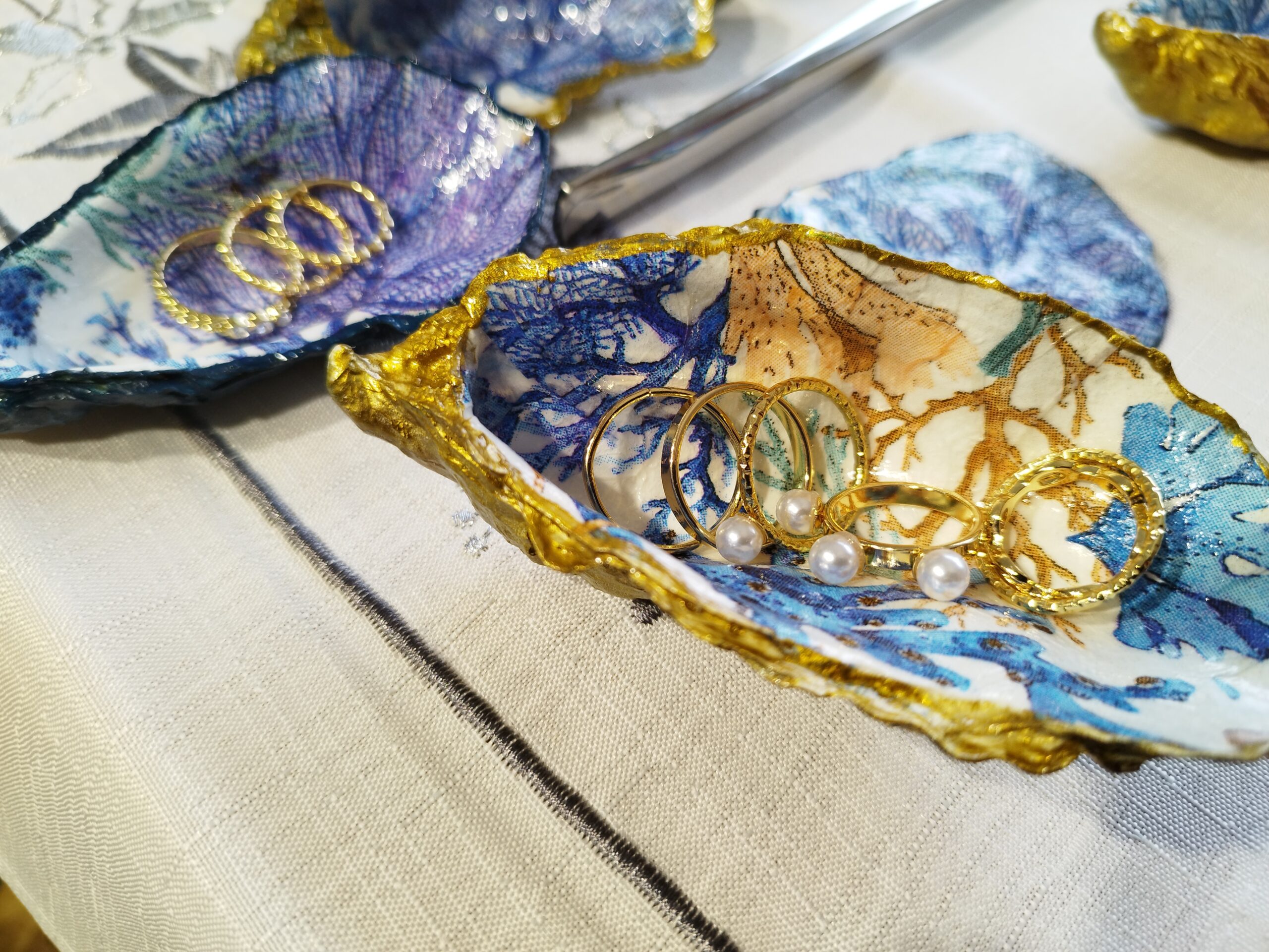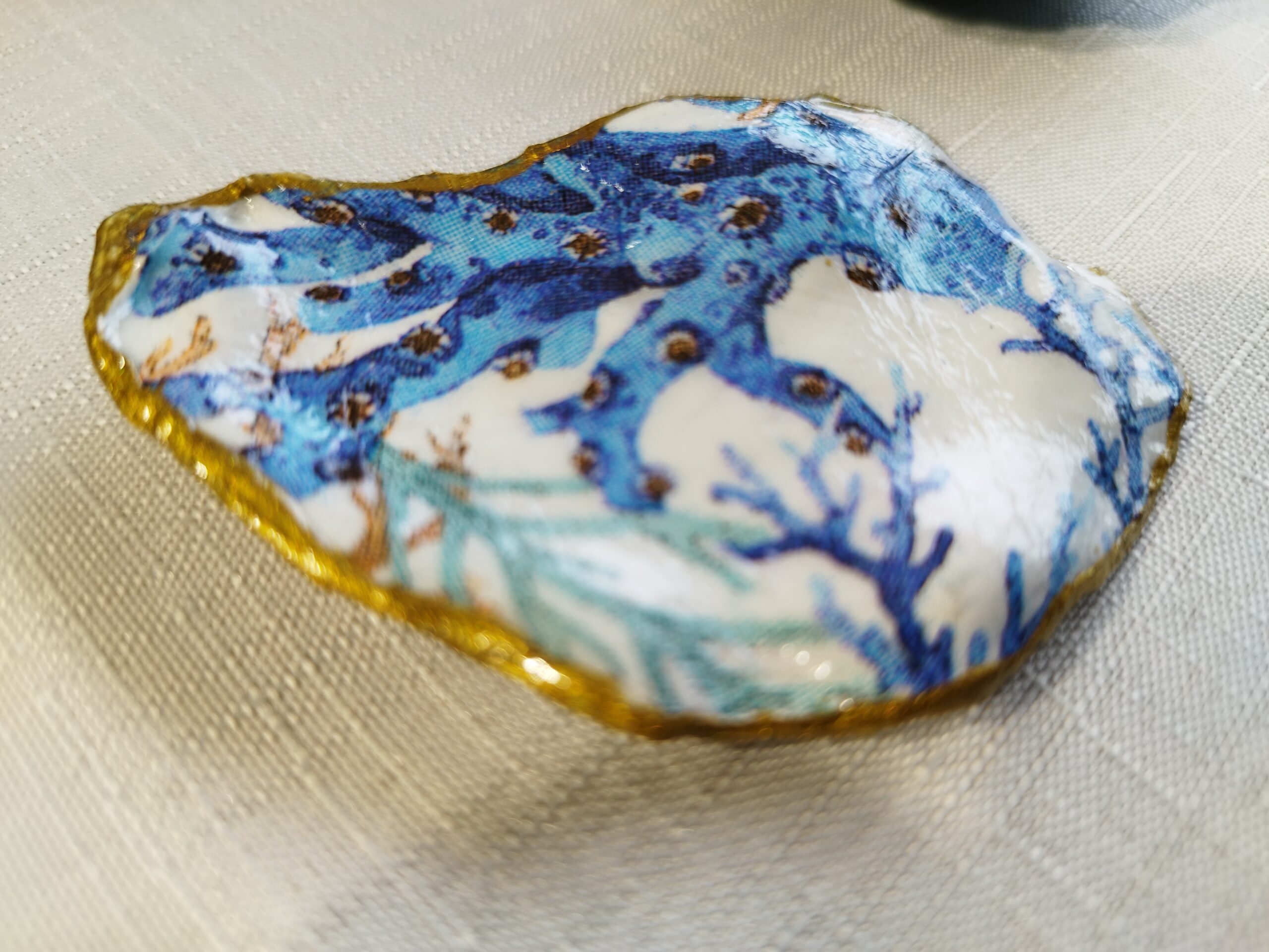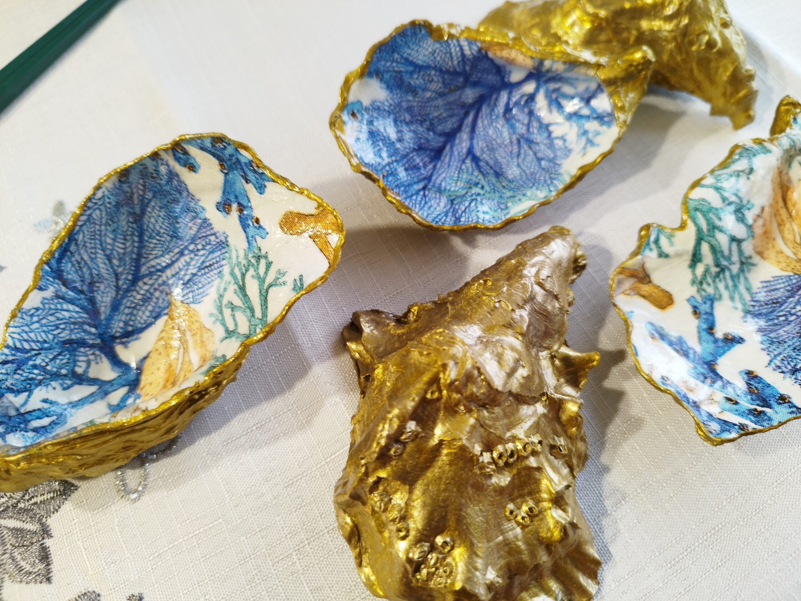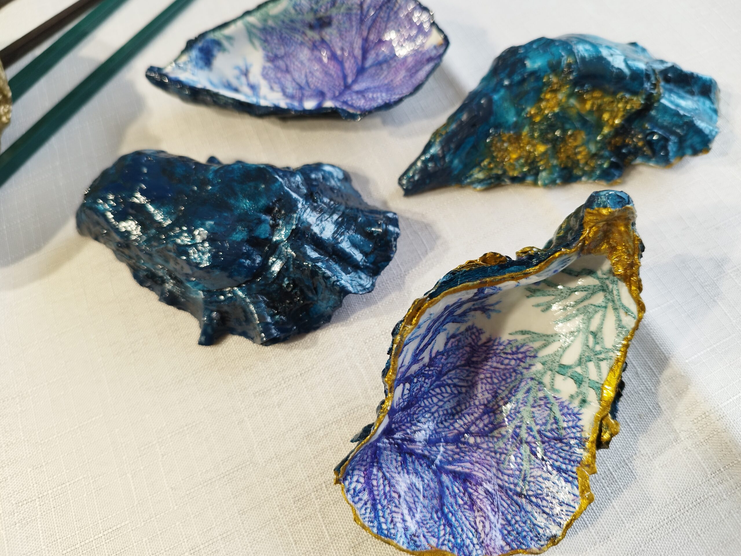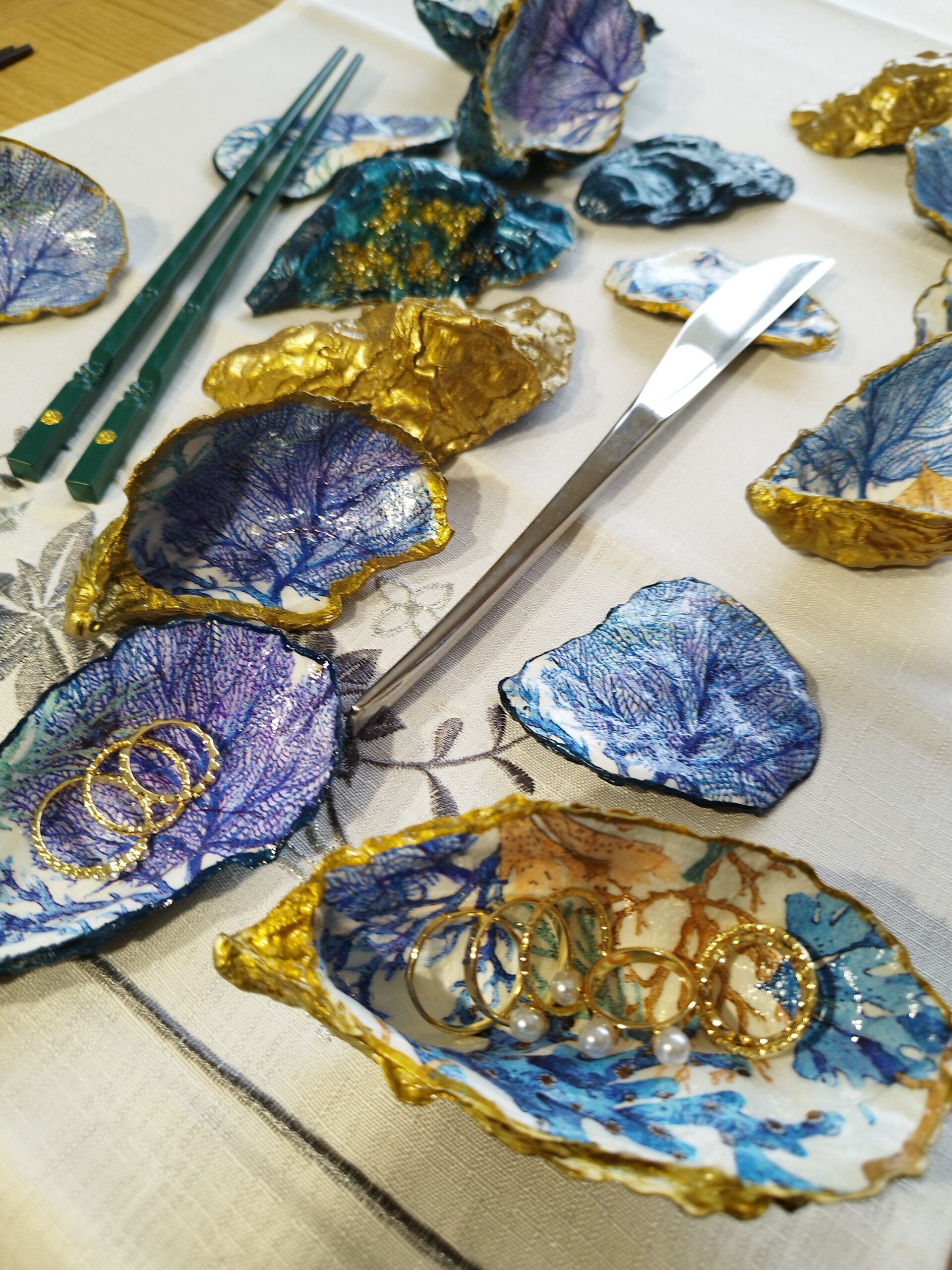 Je réalise à la main ces décorations uniques à partir de coquilles d’huitres creuses naturelles à Pont-Aven en Bretagne. La décoration soignée est réalisée à la main, dorure au pinceau, peinture et papiers décorés, vernis. Chaque « objet d’art » est unique, forme, motifs, liseret de couleur et dos : doré, ou bleu océan. Il y a peu de stock, la réalisation peut être faite à la demande: précisez bien vos souhaits et vos préférences à l’artiste.