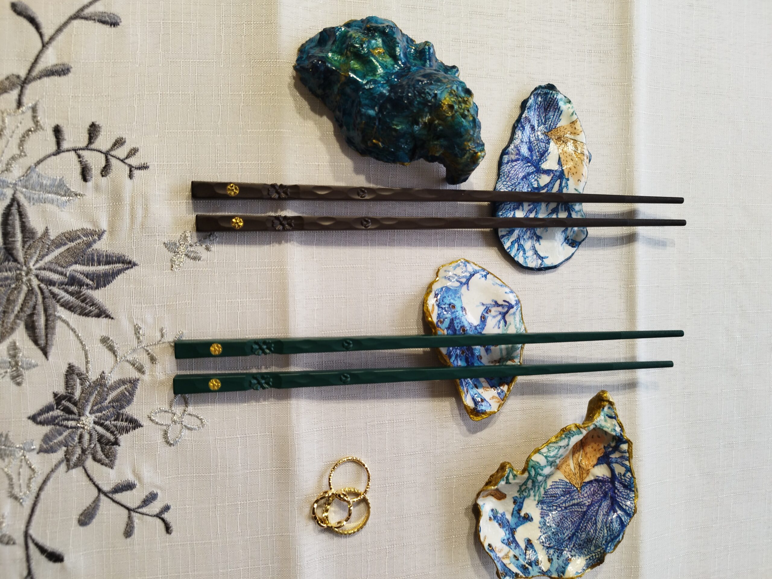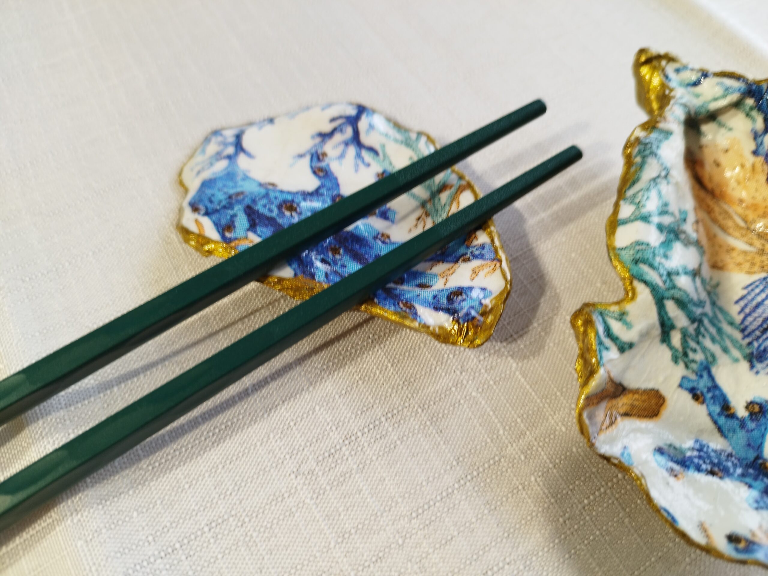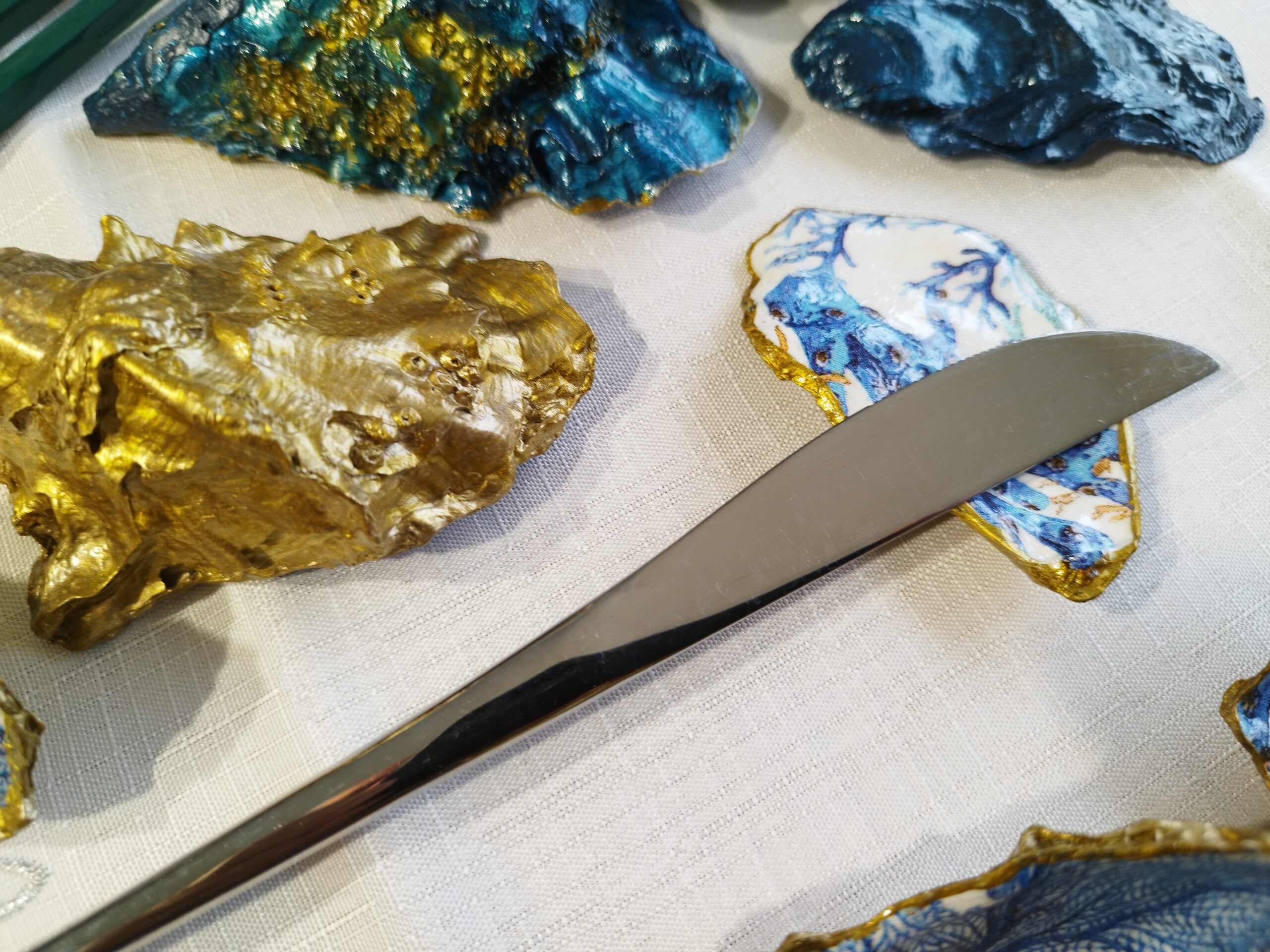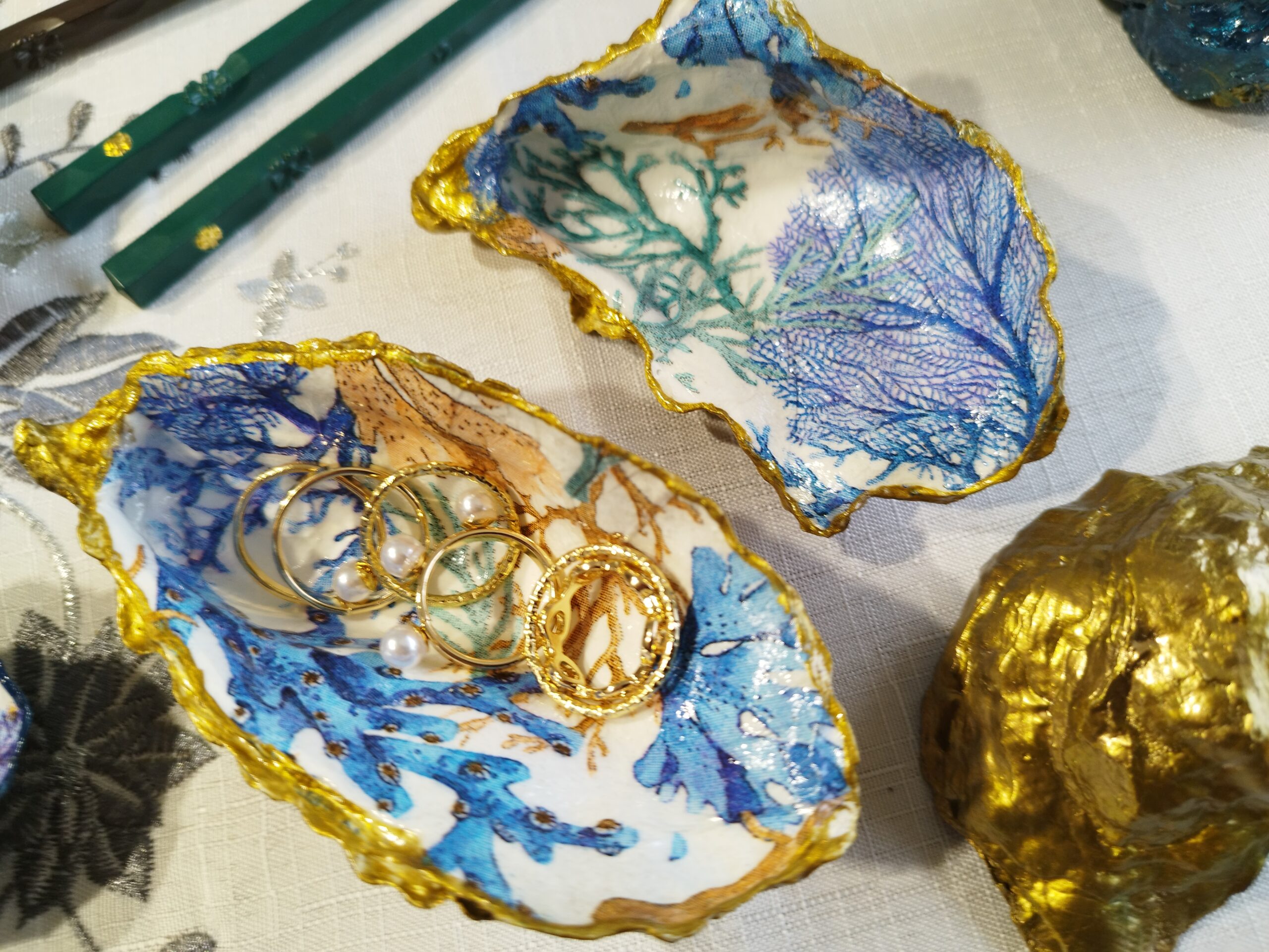Je réalise à la main ces décorations uniques à partir de coquilles d’huitres creuses naturelles à Pont-Aven en Bretagne. La décoration soignée est réalisée à la main, dorure au pinceau, peinture et papiers décorés, vernis. Chaque « objet d’art » est unique, forme, motifs, liseret de couleur et dos : doré, ou bleu océan. Il y a peu de stock, la réalisation peut être faite à la demande: précisez bien vos souhaits et vos préférences à l’artiste.