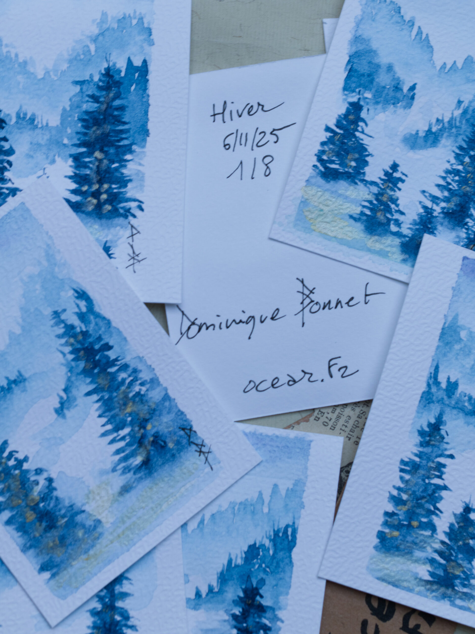 Voici une petite série de 8 aquarelles originales, intitulées « Hiver ». Chaque pièce, numérotée et réalisée à la main, représente des paysages hivernaux stylisés, avec des bleus profonds et des touches dorées pour évoquer la lumière sur la neige. Détails : — Format ACEO/ATC (64×89 mm), pratique à collectionner ou à exposer. — Technique…