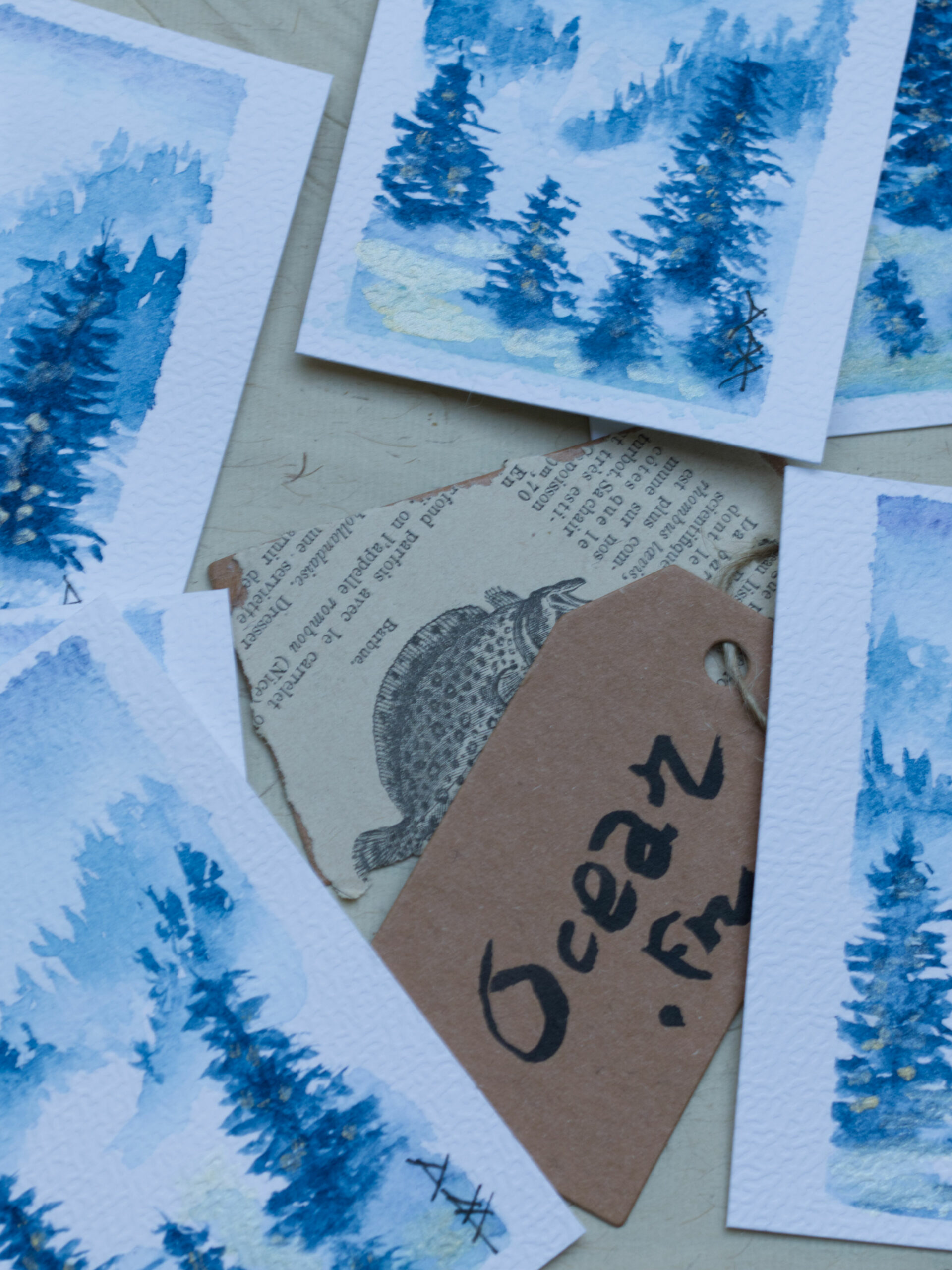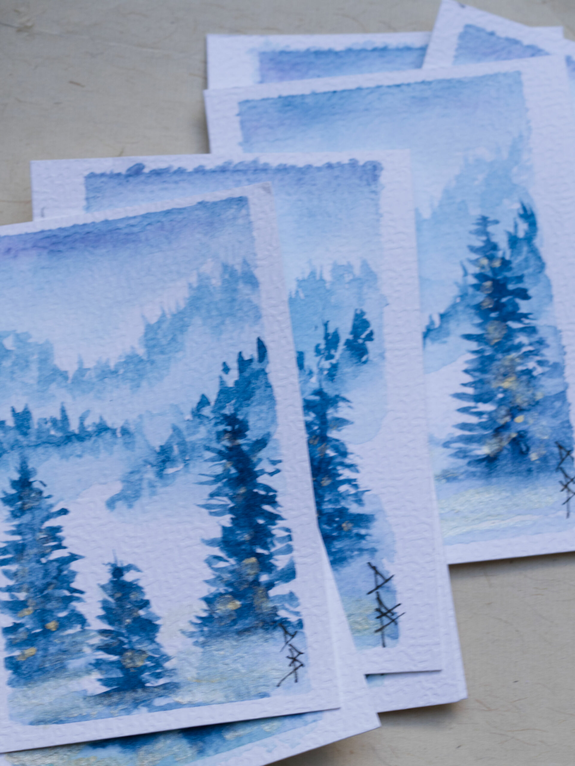 Voici une petite série de 8 aquarelles originales, intitulées « Hiver ». Chaque pièce, numérotée et réalisée à la main, représente des paysages hivernaux stylisés, avec des bleus profonds et des touches dorées pour évoquer la lumière sur la neige.