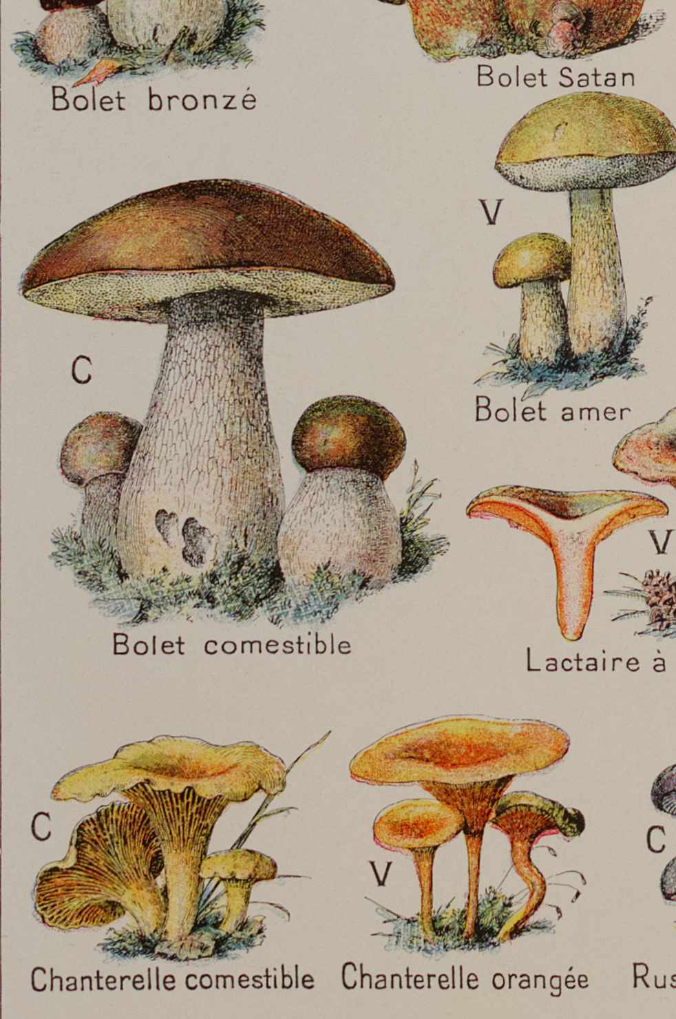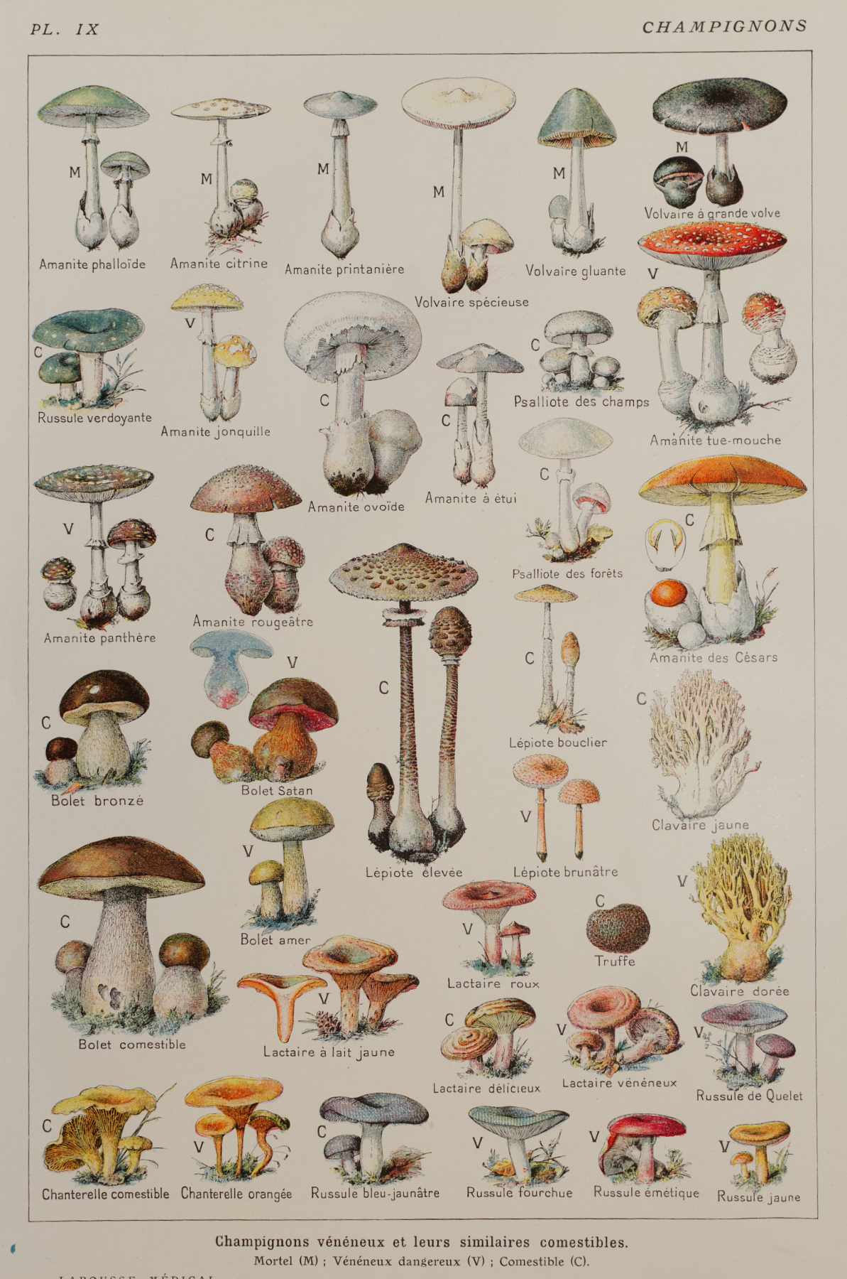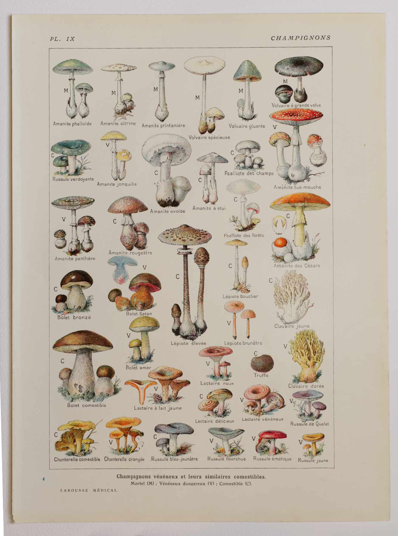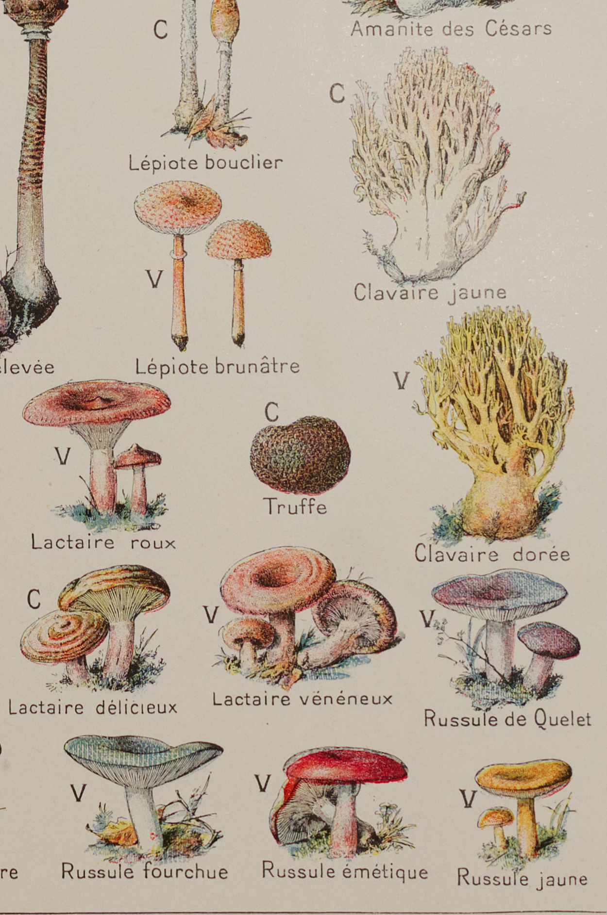 Planche botanique d’époque « Champignons vénéneux et leurs similaires comestibles » de 1924