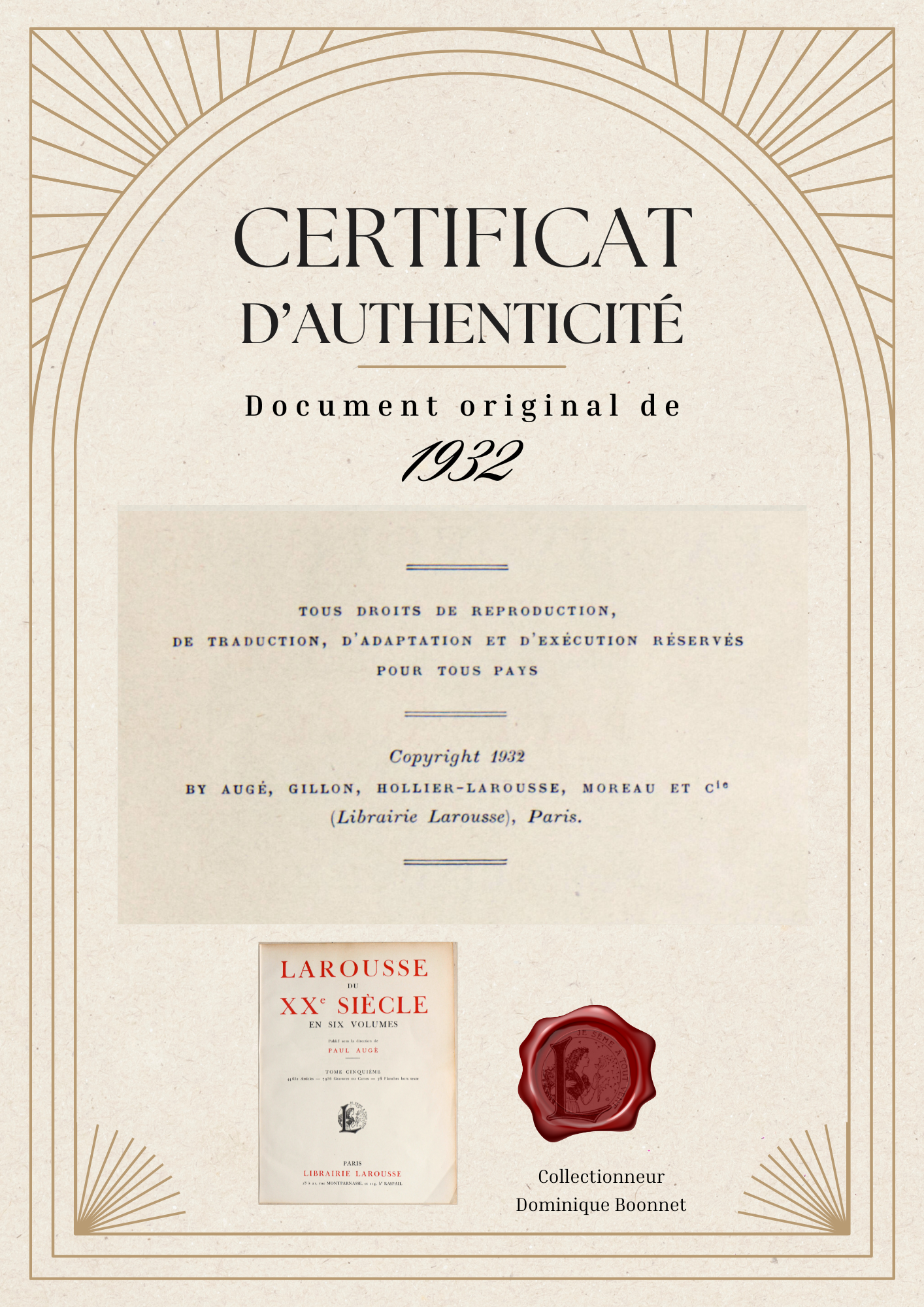 – Authenticité garantie : Édition originale de 1932, extraite du Larousse du XXe siècle – pas de réimpression moderne.
