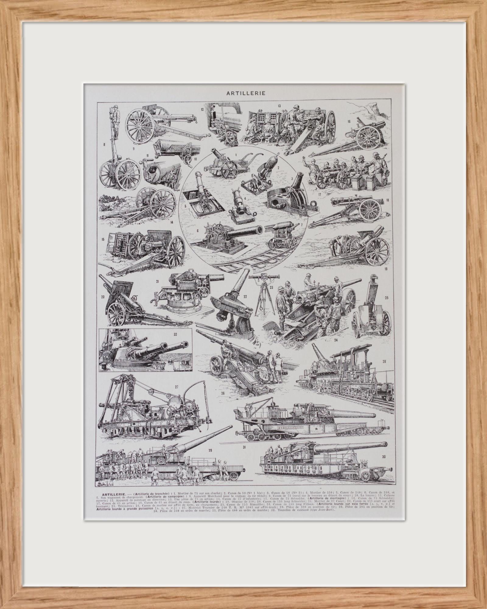 Découvrez une planche recto-verso exceptionnelle retraçant l’histoire de l’artillerie, des premiers bombardes du XVe siècle aux canons modernes du début du XXe siècle. La première planche illustre l’évolution des uniformes, des canons et des tactiques d’artillerie à travers les siècles, avec des représentations détaillées des artilleurs, des pièces d’artillerie emblématiques (comme le canon de Gribeauval, les obusiers, les mortiers), et des scènes de bataille. La seconde planche se concentre sur les innovations techniques et les canons lourds, incluant des pièces de tranchée, des canons de campagne, des mortiers modernes, et même des pièces ferroviaires, accompagnés de schémas explicatifs et de vues en coupe.