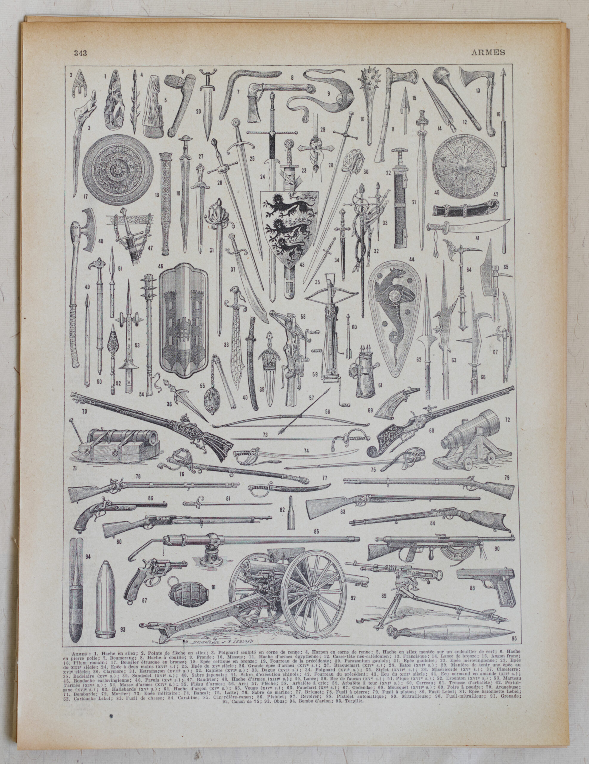 Découvrez une planche recto-verso historique extraite du Larousse du XXe Siècle (1928), dédiée aux armes à travers les différentes époques. Ces illustrations détaillées offrent une vue exhaustive des armements, depuis les armes anciennes jusqu’aux armes modernes du début du XXe siècle.