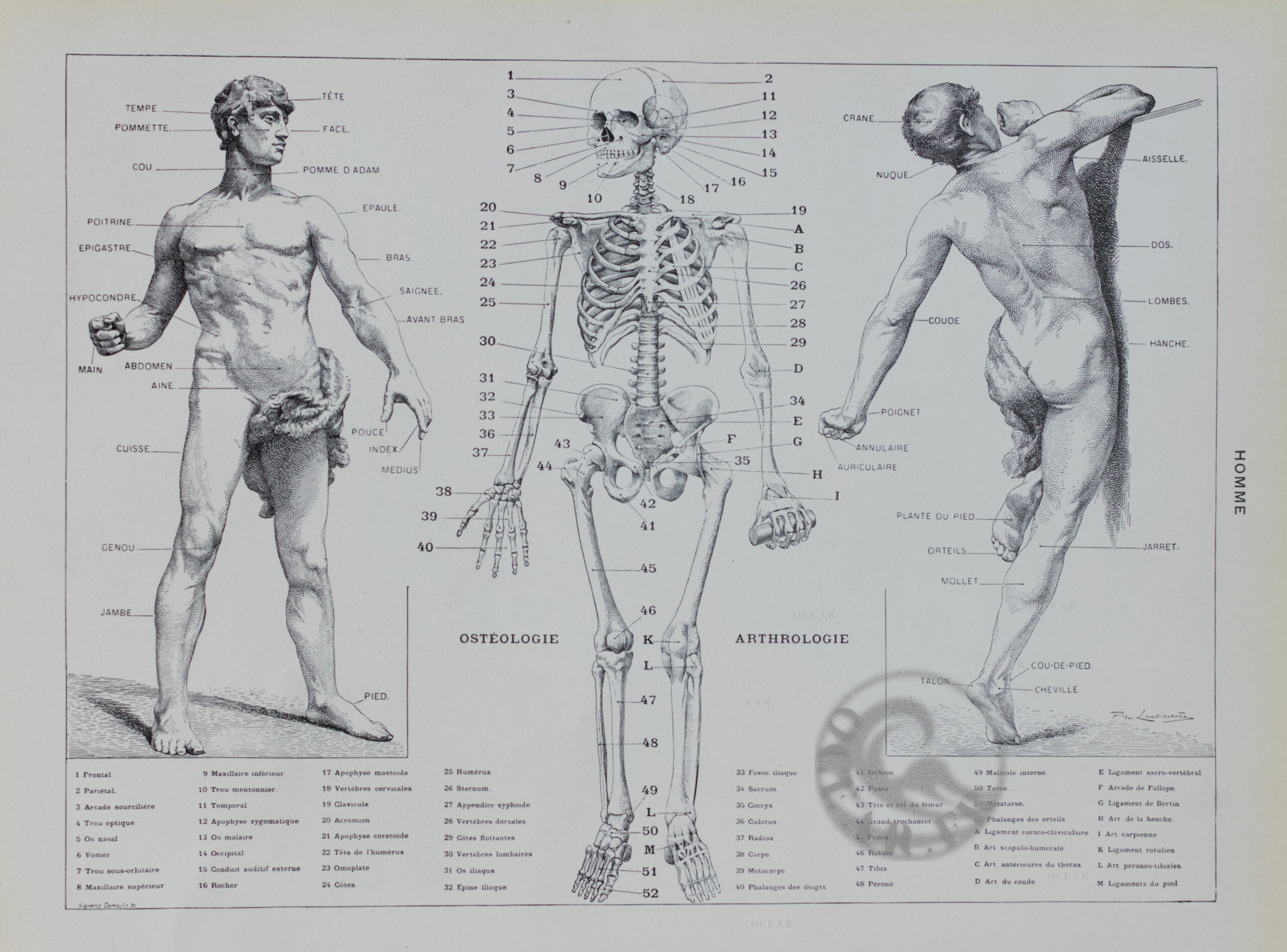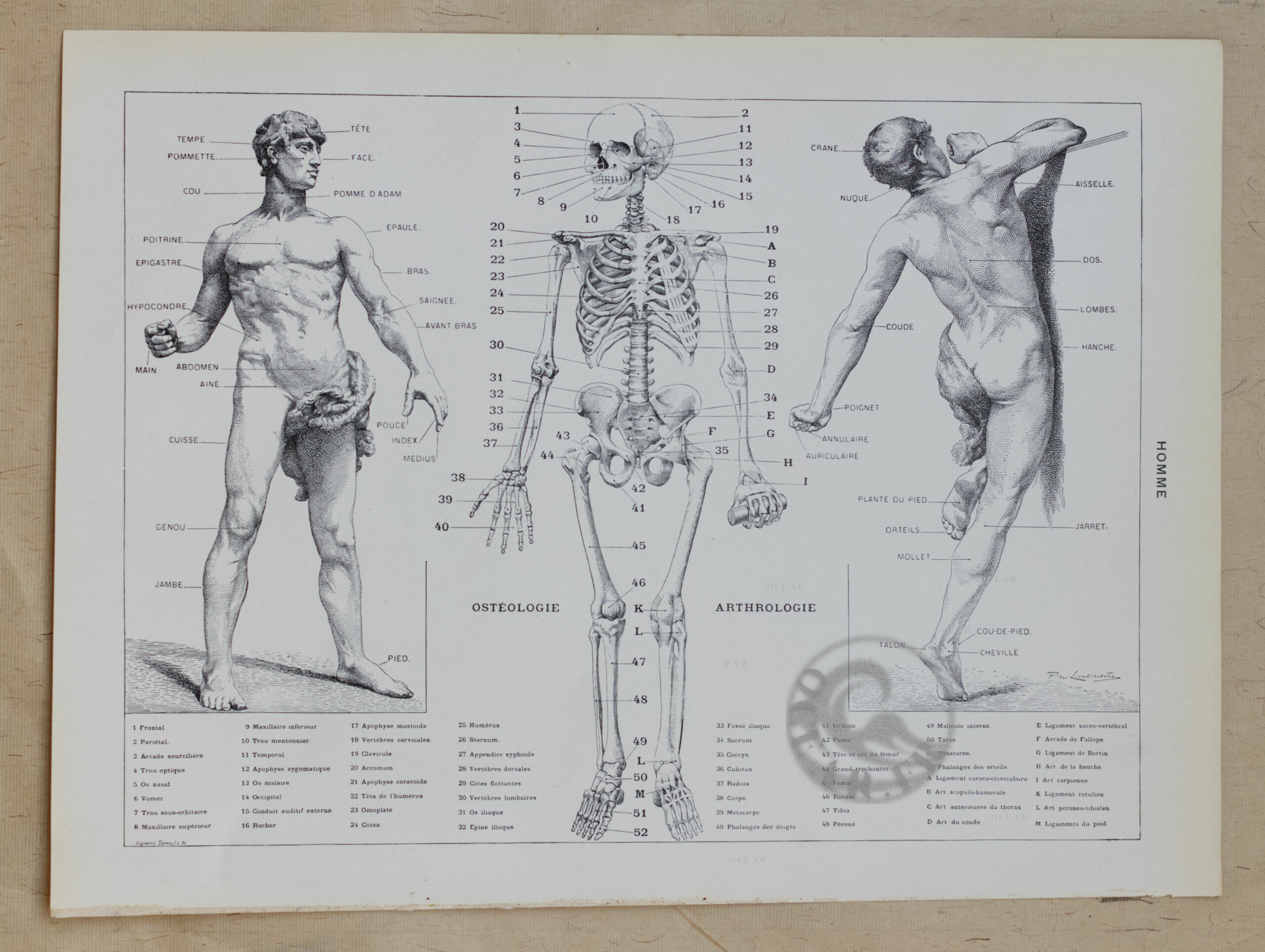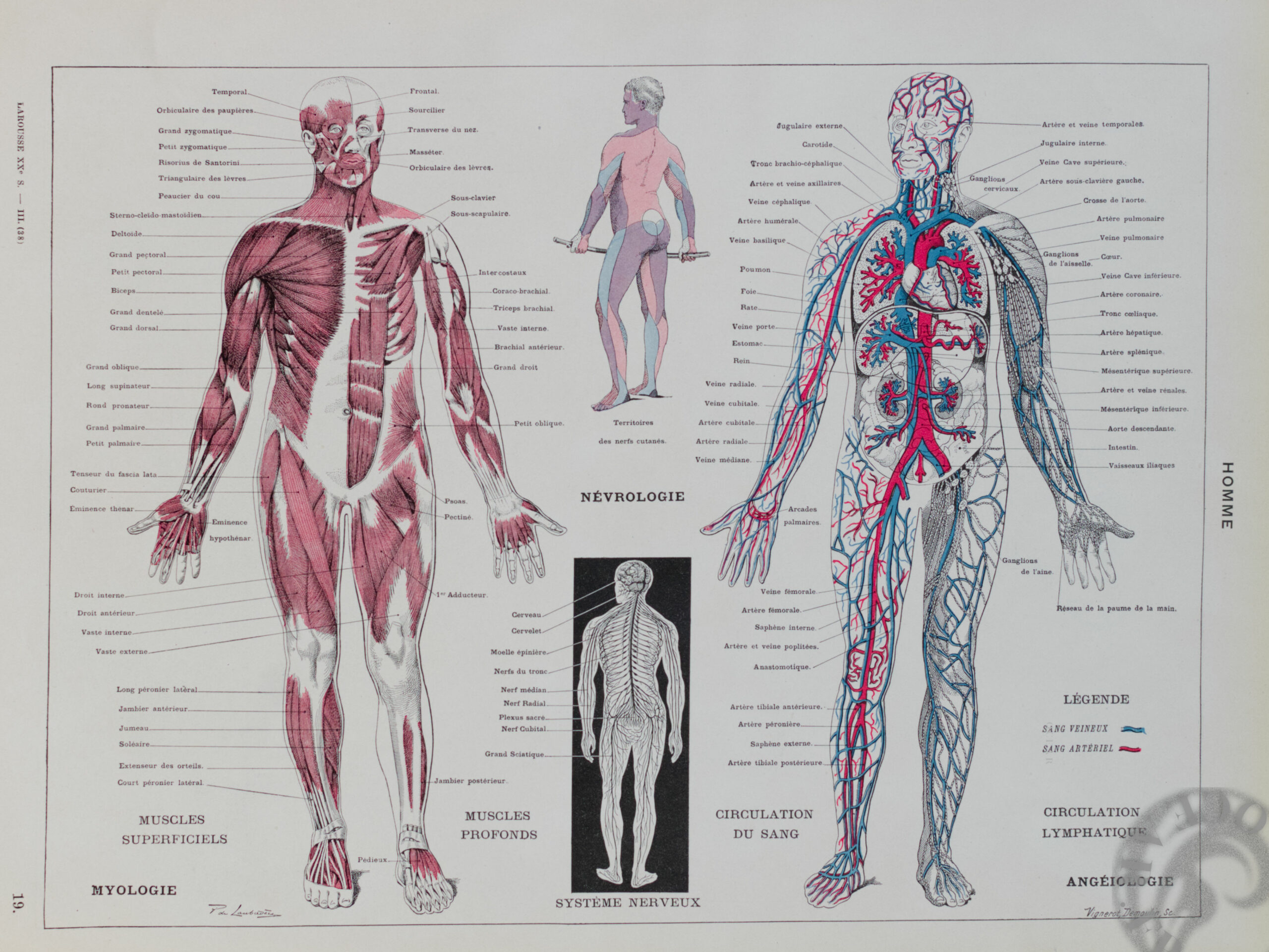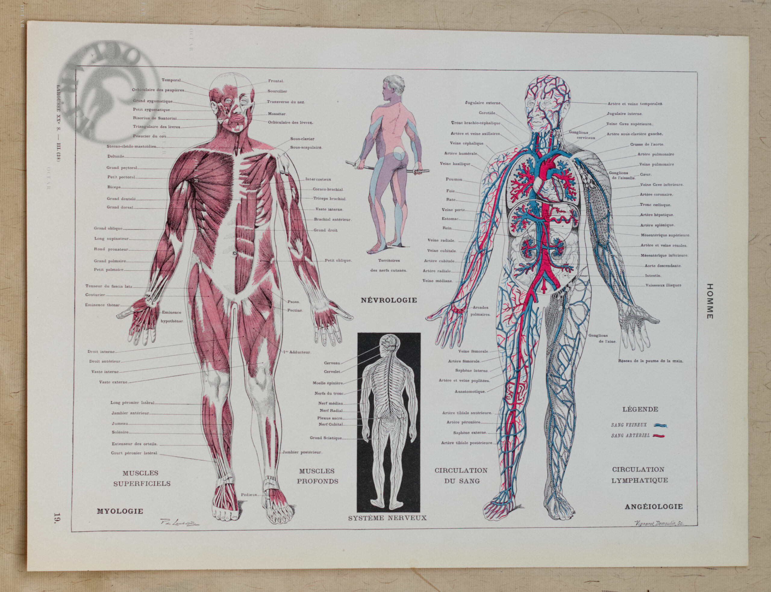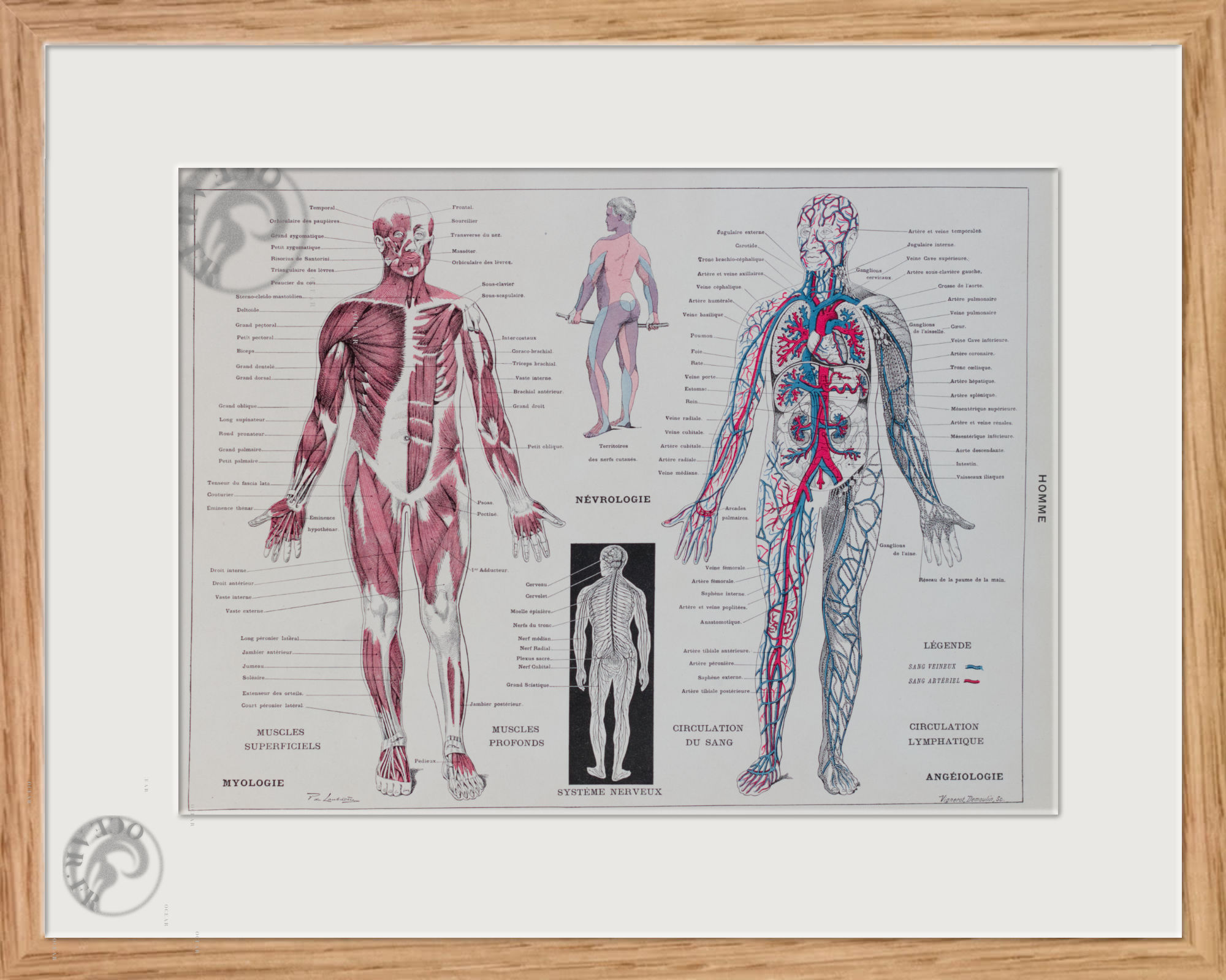 Découvrez une planche d’anatomie humaine exceptionnelle, édition originale de 1930, extraite du Larousse du XXe Siècle. Au recto, une représentation détaillée des muscles superficiels et profonds, du système nerveux et des territoires des nerfs cutanés, illustrée en couleur pour une clarté optimale. Au verso, une étude complète de l’ostéologie (squelette humain) et de l’arthrologie (articulations), accompagnée de légendes précises et d’une vue d’ensemble des os, ligaments et articulations.