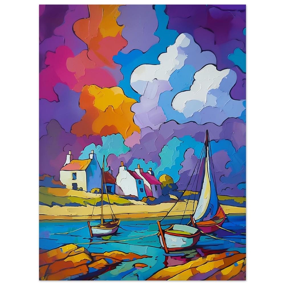 La scène représente un paisible rivage breton où des voiliers colorés flottent doucement, reflétant les nuances changeantes d’un ciel dramatique. Les maisons bretonnes nichées sur les collines ajoutent une touche d’authenticité et de chaleur, évoquant le charme intemporel des villages côtiers.