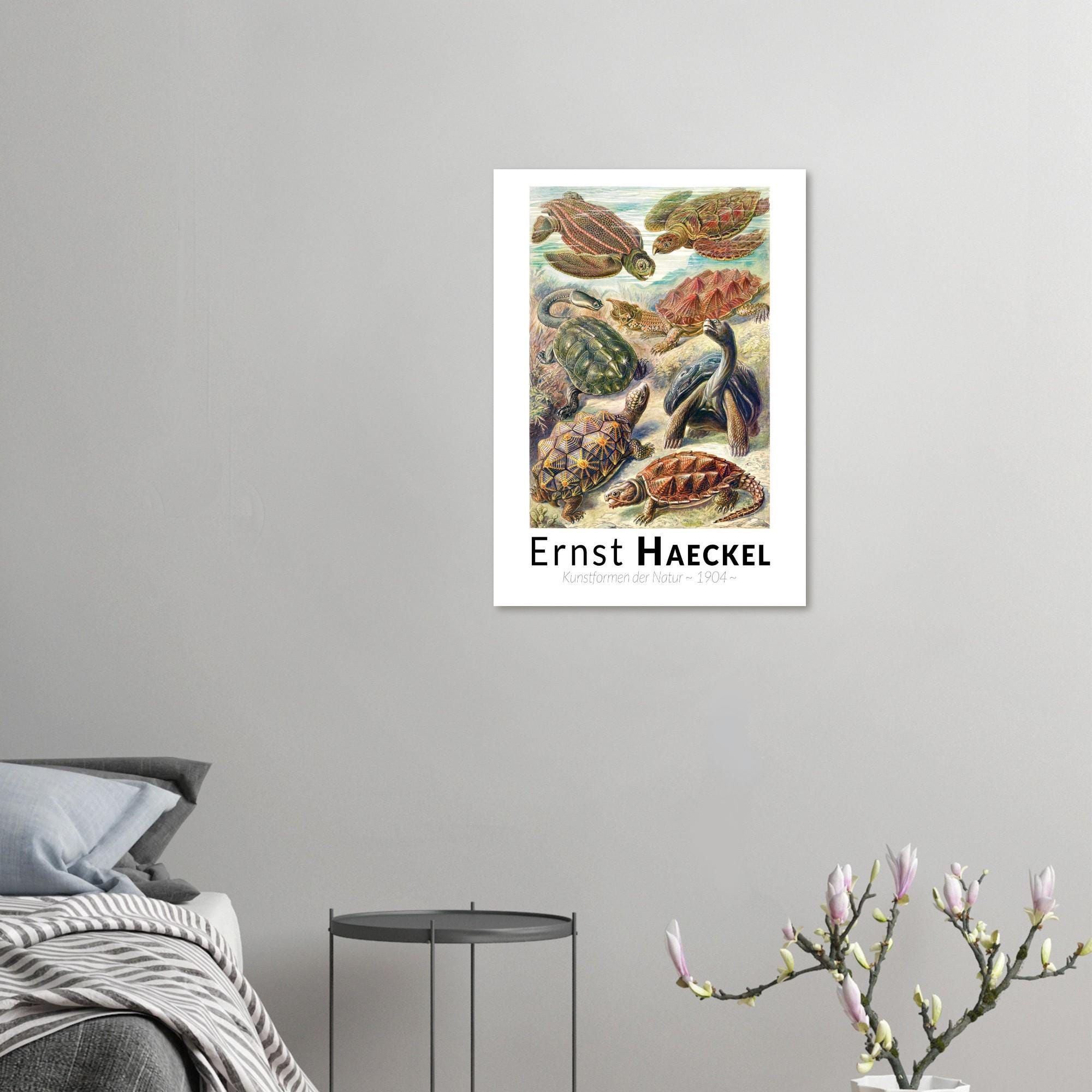 Découvrez ce magnifique poster représentant la grande variété des tortues, une illustration scientifique emblématique d’Ernst Haeckel, extraite de son œuvre « Kunstformen der Natur » (Les Formes artistiques de la nature, 1899). Ce chef-d’œuvre allie précision scientifique et beauté artistique, avec des détails minutieux et des couleurs vibrantes.